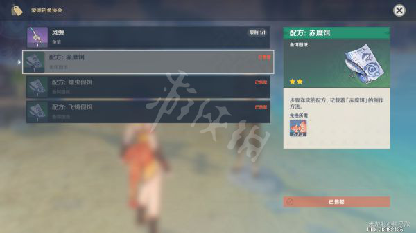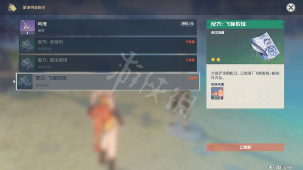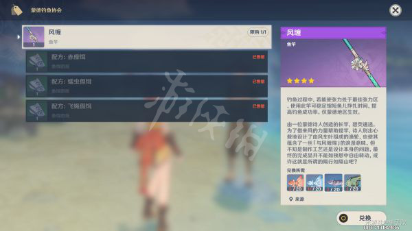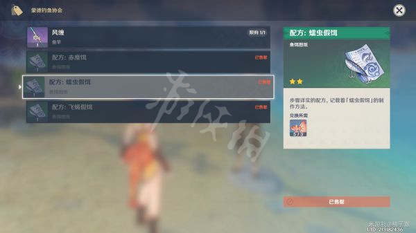 三种鱼饵饵料的配方图纸和一根仅限蒙德钓鱼有增益的鱼竿。初始钓花鳉的鱼饵在合成台合成。