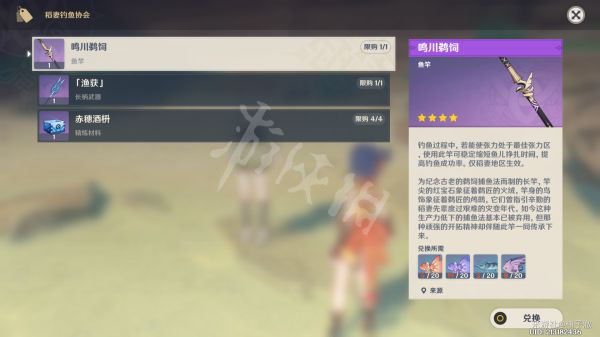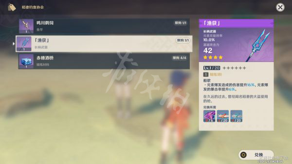 一根仅限稻妻钓鱼有增益的鱼竿,一柄长柄武器“渔获”和它的精炼素材。