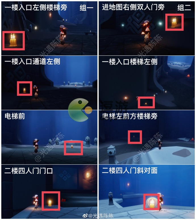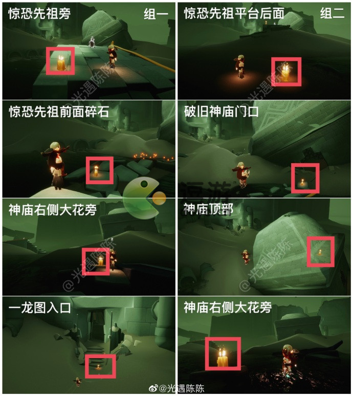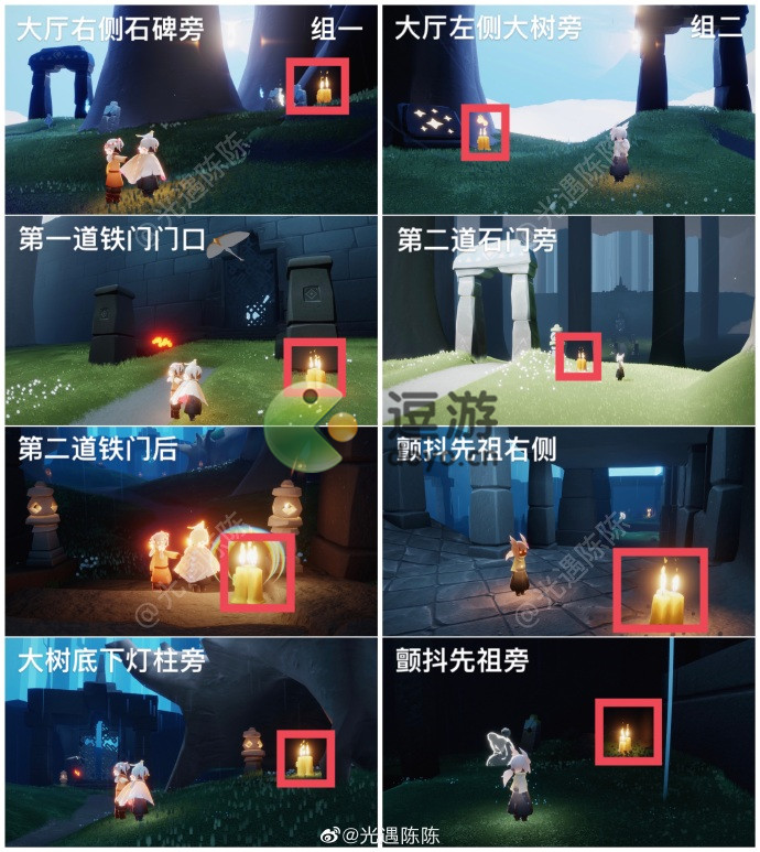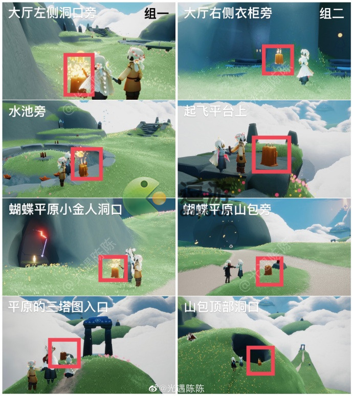 1.寻找这个蜡烛的时候玩家们要注意一下先祖站的位置,站在什么地图的门口,那么今天的蜡烛就在哪个地图上,下面小编就为玩家们介绍一下光遇表演季全部蜡烛位置。