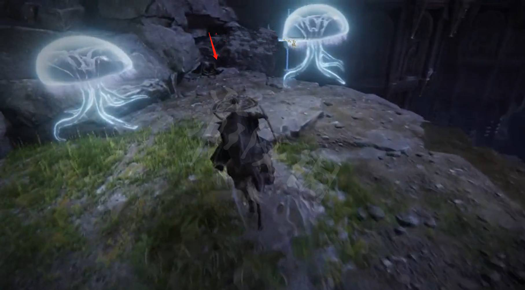 5、沿着山脚走,来到有灵魂水母出没的地方,从悬崖边缘以石头为平台一路跳下;
