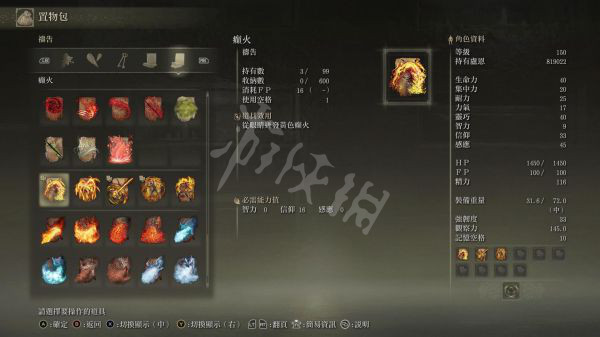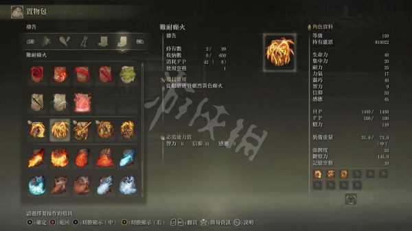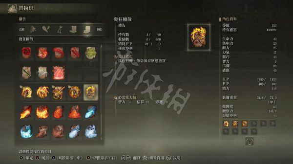 癫火系列祷告的专用触媒。能让癫火祷告的伤害增加20%。吃4属补正,压等情况下导致它的伤害根本比不上同样是重量0.0、能累积异常的龙飨印记。