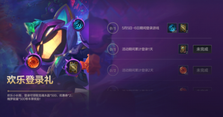 满足条件即可领取龙魂水晶*500、欢乐登录礼皮肤抵扣券*2、魄罗能量*500等丰厚奖励!