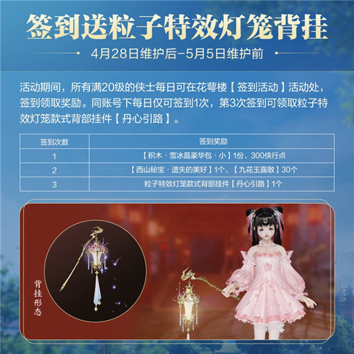 随着新资料片的开启,全新粒子特效背部挂件签到即可带回家!今日维护后至5月5日维护前,所有满20级的侠士登录游戏后,可前往运营活动界面“花萼楼”签到领取“积木·雪冰晶豪华包·小”、“西山秘宝·遗失的美好”及粒子特效灯笼款式背部挂件“丹心引路”等诸多好礼!