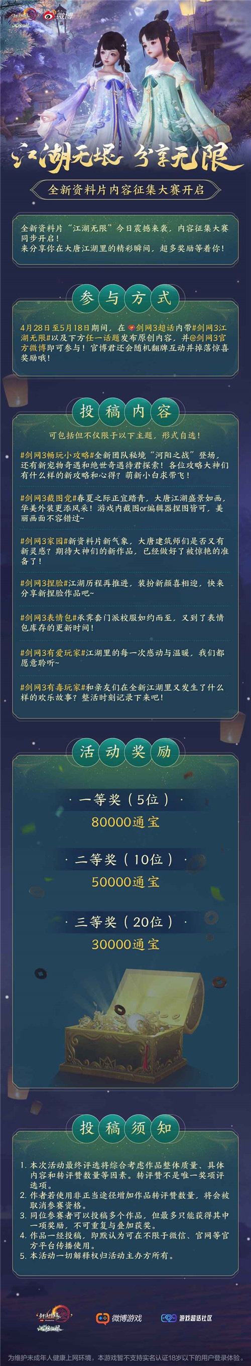 与此同时,@剑网3官方微博 也带来了有趣的新活动!今日起至5月18日期间,侠士可前往@剑网3官方微博 参与全新资料片内容征集大赛,分享你在大唐江湖的精彩瞬间,参与即有机会获得超多丰厚奖励!