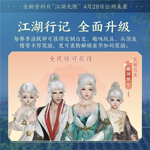 与此同时,江湖行记合并“锦绣霓裳”系统全面升级上线,以赛季为节点,在原有基础上增加更多奖励——任务历练更休闲,每赛季可获得大量赤阳金碎片、五行石、迟来的钦佩及“豪侠行记外观折扣券”等超多礼品,此外还有全民定制白发“幽涧愀兮”免费得!与此同时,“锦绣霓裳”也升级为“豪侠行记”,内含定制黑发“幽涧愀兮”、豪华披风“越熙银羽”等多款惊喜豪礼,摸鱼即可轻松毕业,后期突击亦可全部解锁!