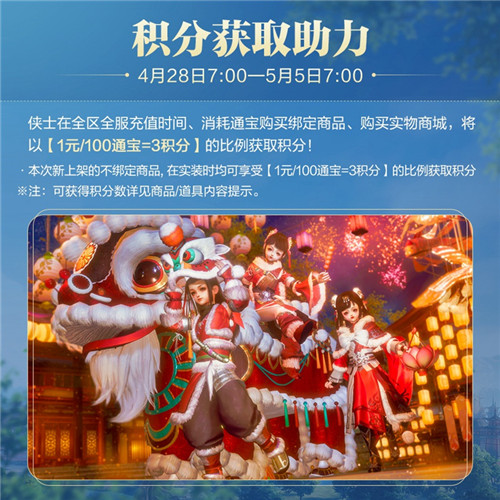 福利优惠又添新意,充消积分三倍回馈!今日起至5月5日7:00期间,侠士在全区全服充值时间、消耗通宝购买绑定商品、购买实物商城,将以【1元/100通宝=3积分】的比例获取积分!