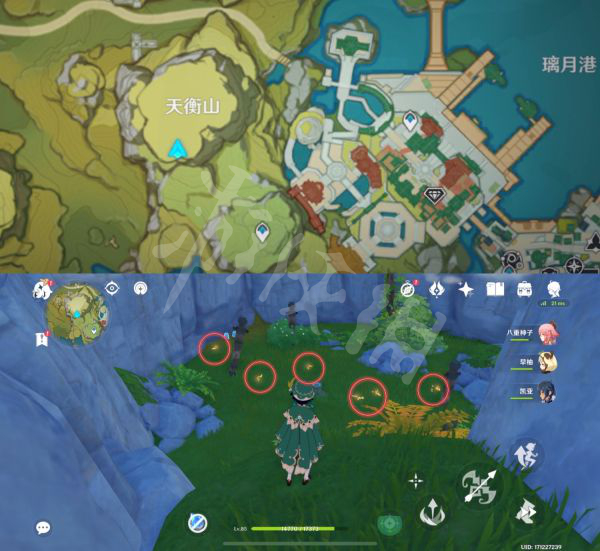 3)天衡山山洞中有6只晶蝶,从地图下方传送点一直走可以看到好多丘丘人,在它们背后山洞中就能找到晶蝶