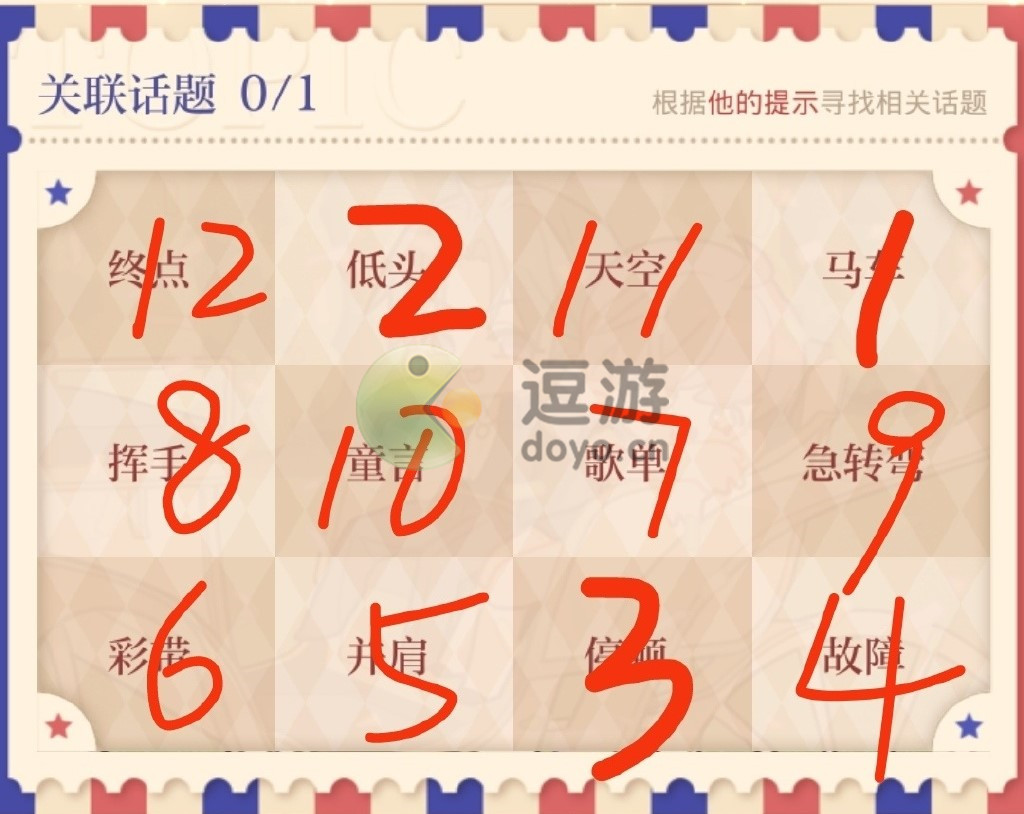 1、话题二落日逃亡选择顺序:1马车,→2低头,→3停顿,4,故障→5并肩,→6彩带,→7歌单,→8挥手,→9急转弯,→10童言,→11天空,→12终点