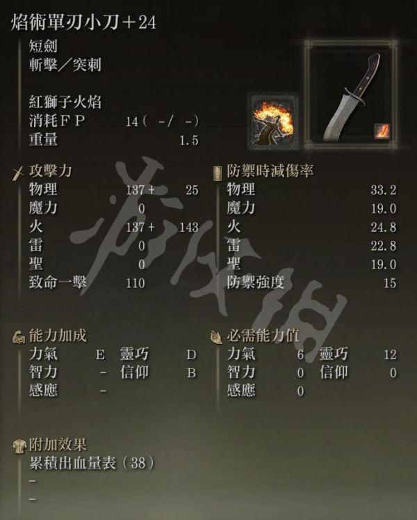 5.如果要双匕首平砍,武器推荐单刃小刀,单刃小刀自带出血,且是灵巧比较高的补正,一手质变焰术,一手质变成寒冷,可以出血冻伤全都要,然后再用火焰伤害来取消冻伤的效果。