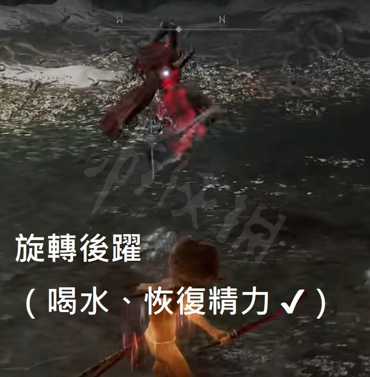 跳跃突刺:看到跳跃突刺时翻滚即可,翻滚后可以安心喝水、恢复精力条。