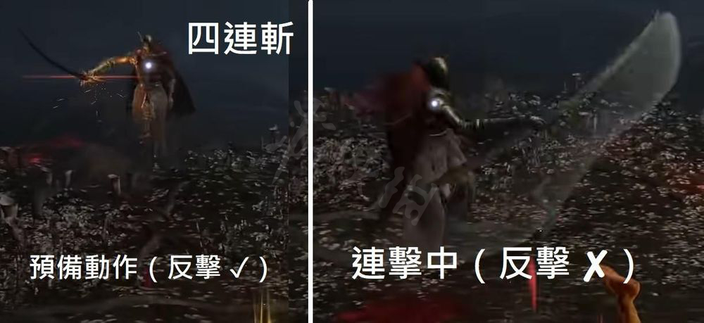 四连斩:四连斩的预备动作是伸出刀并且出现火花,可以反击断招,但在连击过程中无法反击(必须翻滚),四连斩后会快速再接二连斩,如果没自信躲过,举盾扛即可。