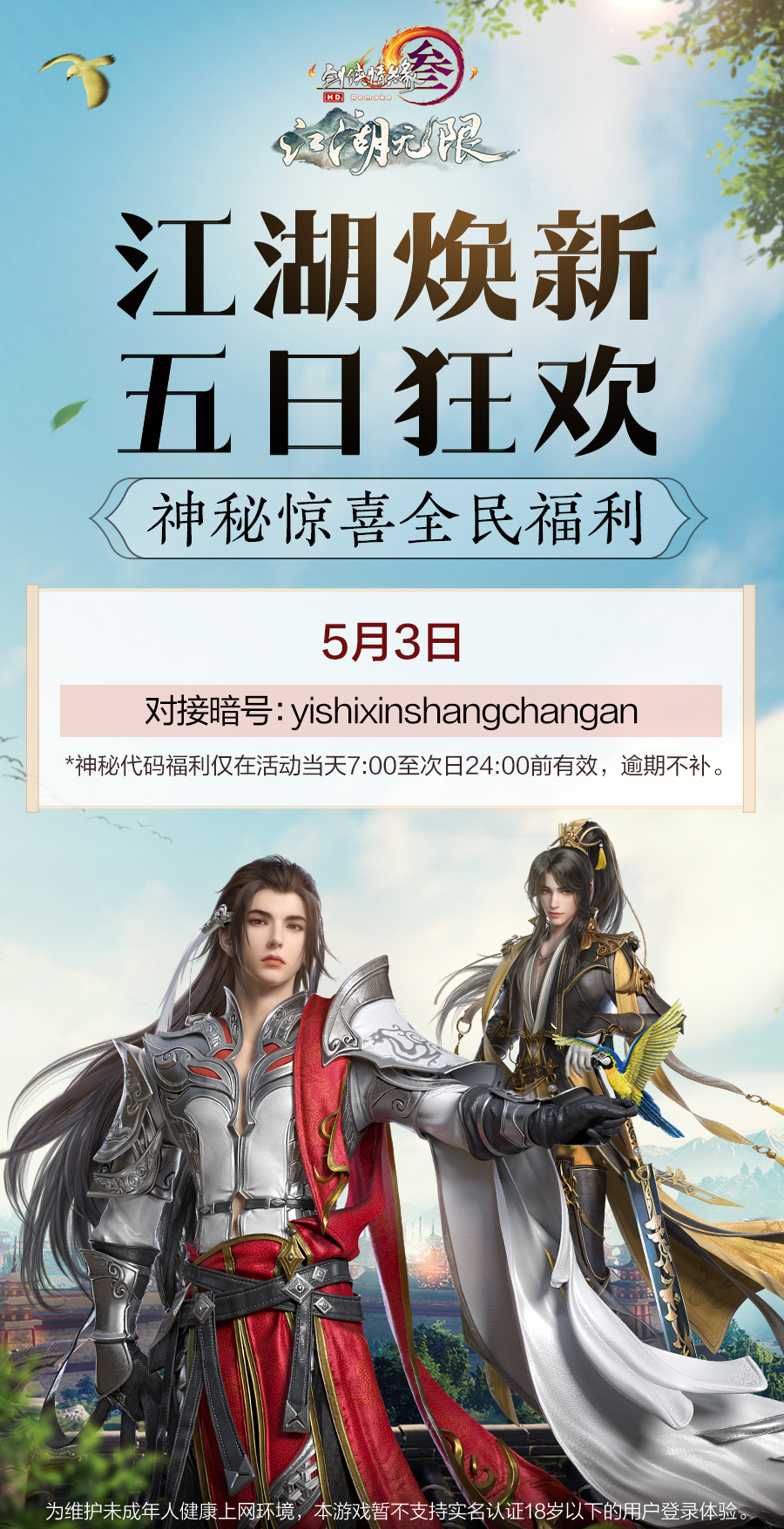 五一假期转眼已经到了第四日,《剑网3》也为诸位带来了今日的神秘暗号,侠士前往游戏内输入暗号即可兑换惊喜福利!