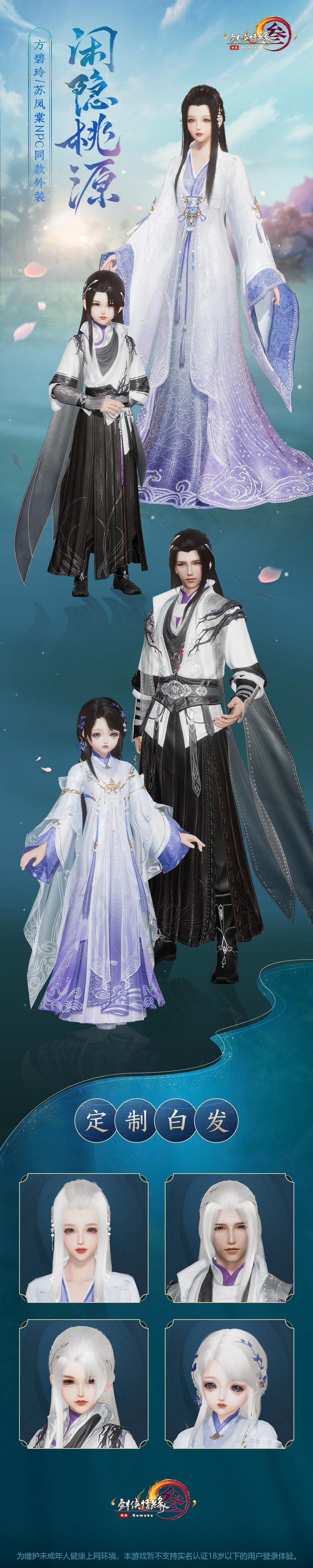 酒酌半盏度桃源,备受侠士期待的苏凤棠与方碧玲同款精美外装“闲隐桃源”今日抢先亮相,掀起大唐新风尚!男款为人气NPC苏凤棠同款,成男款完美还原苏凤棠的谦雅君子风采,水墨衣衫更衬侠士洒脱不羁;正太衣着潇洒,墨兰暗纹细腻生动,寄托少年高洁之志;女款参照方碧玲的清雅着装,成女款式清素仙雅,裙间似有海浪翻涌,更显方家飘逸之色;萝莉则在此基础上加以改进,鎏金为饰伴轻纱外衣,又添一分遗世独立之仙韵!值得一提的是,本次NPC同款外装更有定制黑发与白发两种不同发色,各具风韵,以供侠士自由选购!