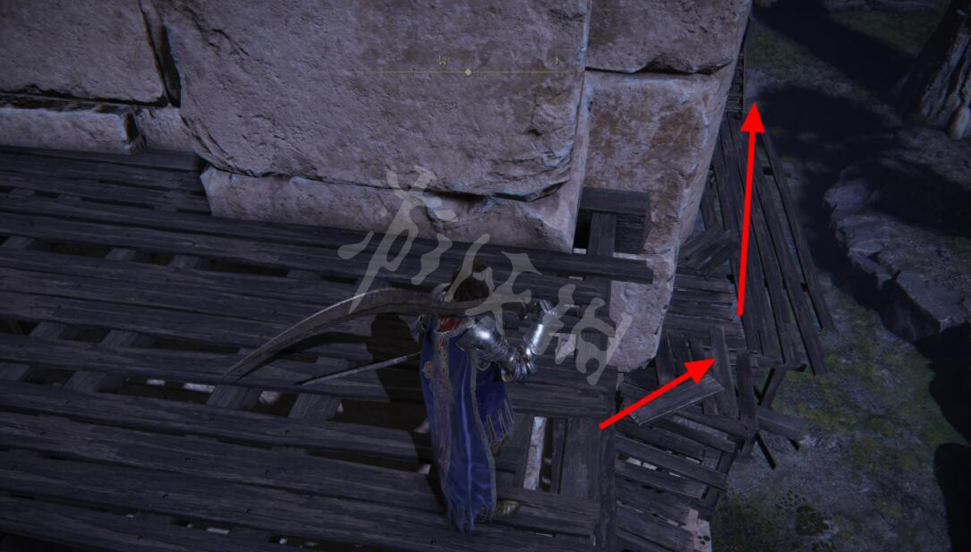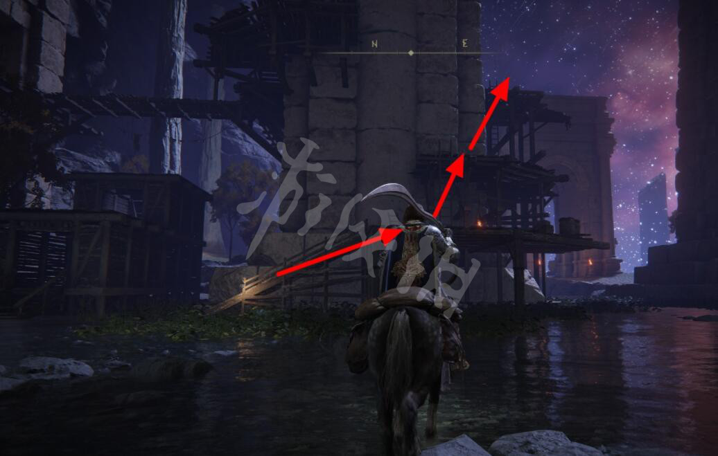 钩剑可以在希芙拉河赐福【信仰者森林】附近的流浪商人出购买,来到位于赐福点南边的下图所示位置。