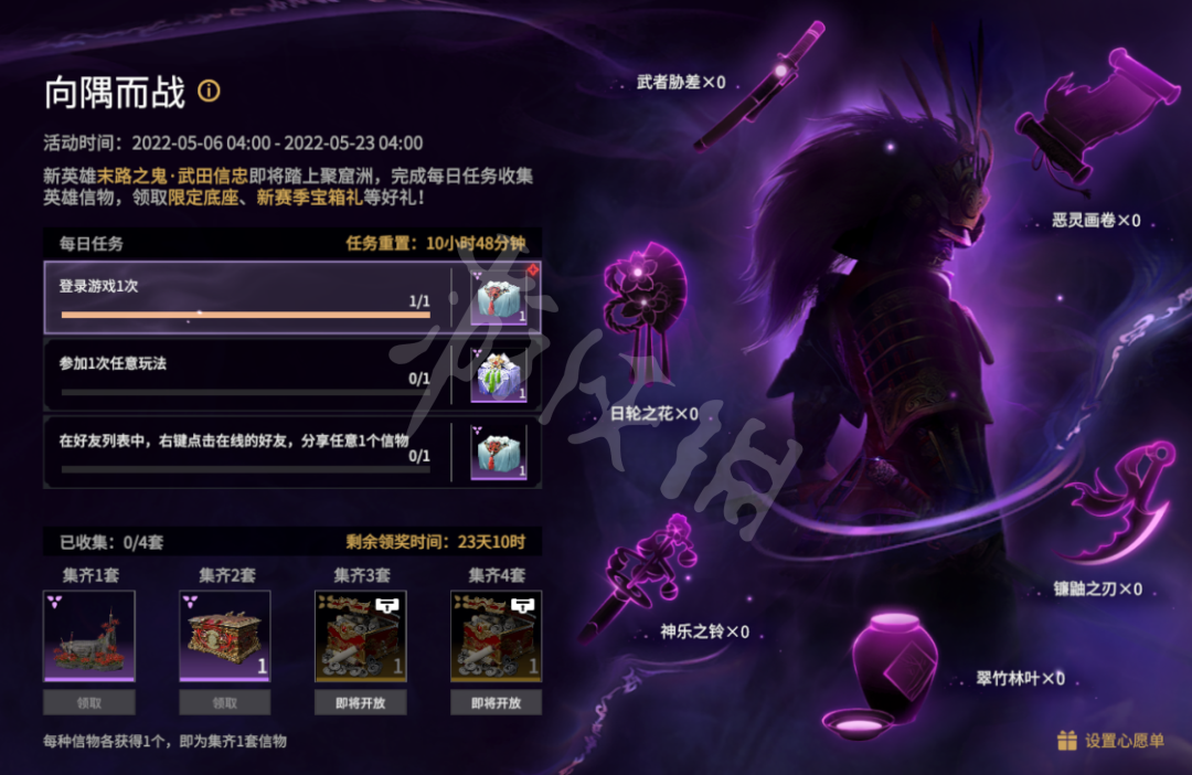 为让各位英雄了解武田信忠的更多情报,“向隅而战”活动即将上线!各位英雄通过完成活动的每日任务,可获得末路之鬼·武田信忠信物,并有额外几率随机获得古币、幻丝、极品时装礼、极品挂饰礼等奖励之一。