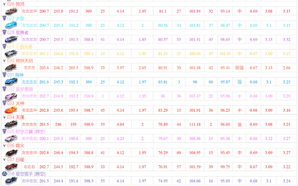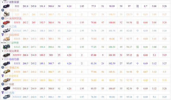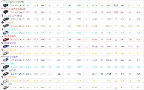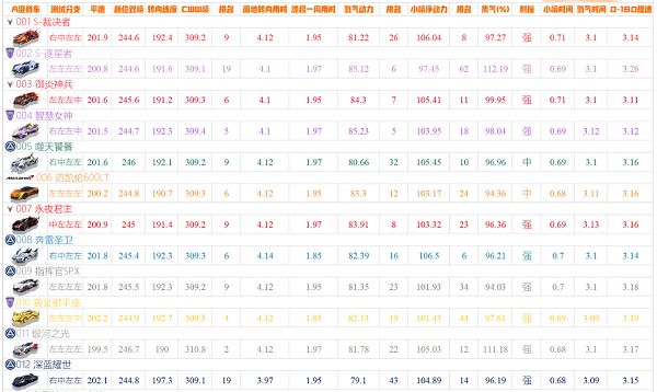 2、排名是按照平跑、断位双喷、转向速度、Cww喷、排名、原地转向用时、漂移一周用时、氦气动力、小喷净动力、焦气等方面来进行测试的,可以说是比较全面了。
