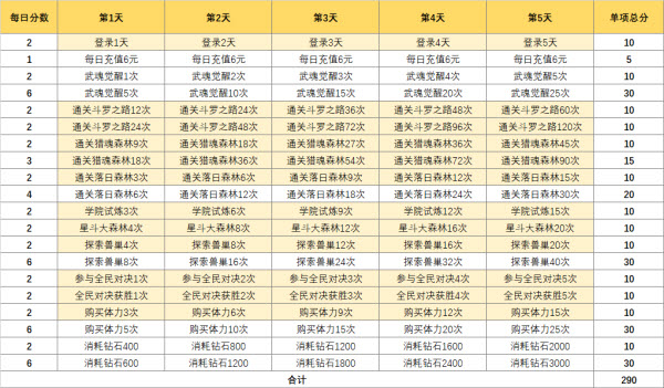 这个图是给大家总结的有关这个活动的积分积累细分图,其中标黄的部分是大家可以较为轻松完成的部分,不过这些标黄的任务全部完成后我们也只能拿到125积分(可以拿到5张武魂觉醒券的奖励),所以想要获得240积分的自选魂髓大礼,大家可能还是需要去消耗钻石、武魂觉醒,或者进行每日充值,这个大家就根据自己的实际需求来吧。