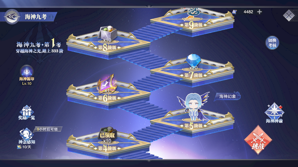 3.选择对应的神位后,我们便会进入到对应神位九考的界面,目前暂时只开启了第一考的测试,而每个神位的第一考都是需要不断的攀登上一座总阶数为333层的阶梯,在攀登的过程中我们会遇到不同的boss,同时也可以拿到不同类型的奖励。