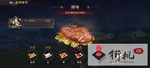 ①【炙肉燔味】烤肉的玩法类似茶点,选择需要烤的肉类,根据路沧崖的提示选择烤肉的火力大小、调料类型和数量。如果是中大火,需在限制时间内进行添柴;调料可以单类多点,不然路沧崖会嫌弃你烤的没有味道。烤肉成功和失败都会获得代币奖励。