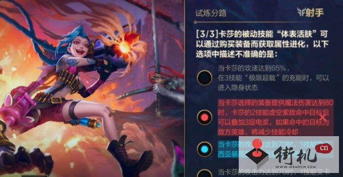 3、问题:卡莎的被动技能“体表活肤”可以通过购买装备而获取属性进化,以下选项中描述不准确的是?