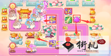 3、鱼刺开完宝箱之后,之后打桃树上面的钱袋,空出的位置放置魔法球和船锚,继续清理障碍物。