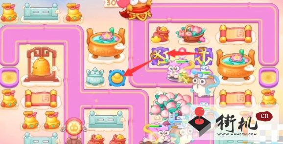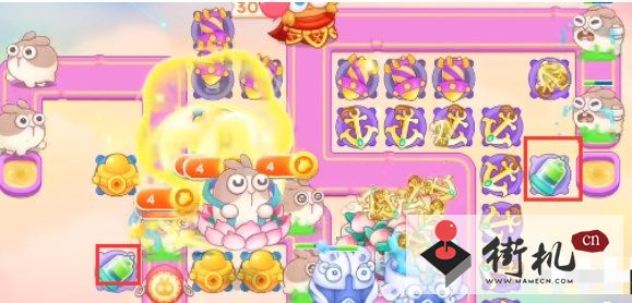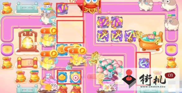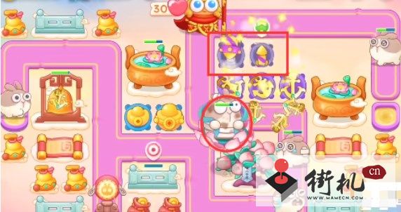 3、在第一轮结束时开始打后方的钱袋,然后在钱袋位置放置两个烟花防御莲花兔。