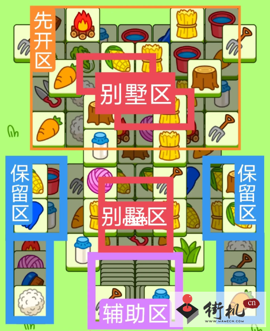 四个斜着的长形别墅组成,开局先消除橙色区,这里压牌此较多,然后按照一层层均匀消除表面牌,不要跨层太多拿牌。必要时可以用盲盒区辅助消除表面牌,尽量还是以别墅区内互相消除为王,蓝色区基本都是明牌,全部保留到后期使用。