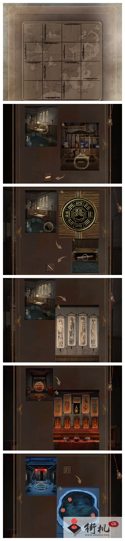 20、点击罗盘进入回忆书房中亮起的吊灯,观察底部图案,根据图案打开现实书房中右下角的盒子机关,获得挂画。