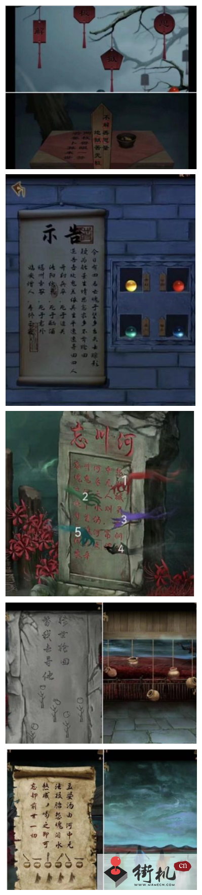 14.奈何桥边,根据枯树下面石碑信息摆放草屋上面挂着的瓶子得到汤柜钥匙,打开汤柜得到四碗泪,湖上出现四只鬼结合桌上信息得到孟婆汤顺序为蓝黄白绿蓝黄,得到孟婆汤。