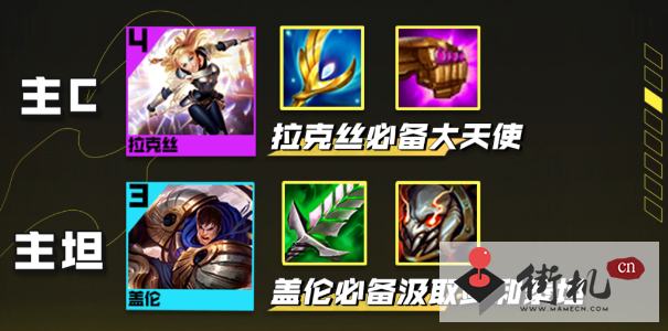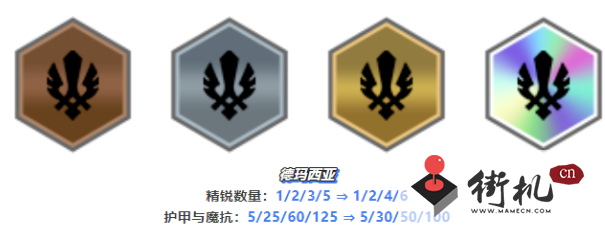 因此阵容核心是开出7德玛西亚羁绊,如果有德玛西亚纹章转职可以直接开冲