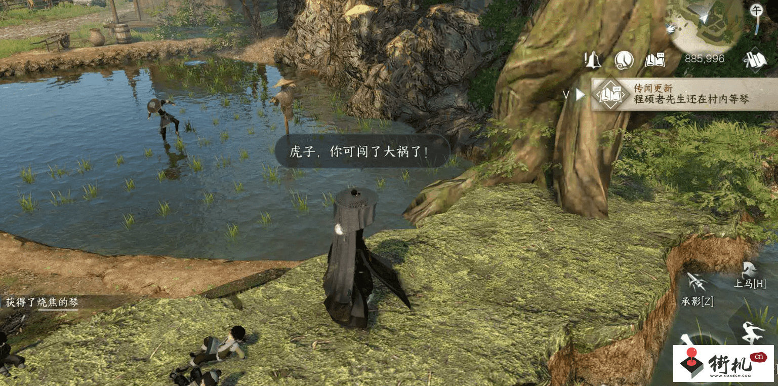 四、到图四桃溪村886.999处向“虎子”提交“不知名的野果”,之后按剧情给琴灭火捡琴