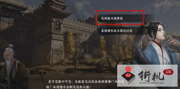 2、接着我们就加入到此对话当中,在此需要帮助他们击败马匪,先调查马匪的情报在说。