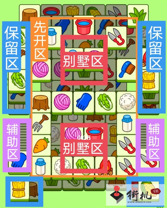 两个方形大别墅,开局先消除橙色区然后按照一层层均匀消除表面牌, 哪里压牌比较多就先消除哪里,必要时可以用盲盒区辅助消除表面牌。尽量还是以别墅区内互相消除为主。蓝色区有叠牌,但是不多,全部保留到后期使用。