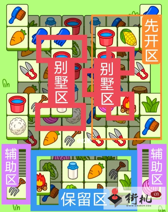 一个工字形大别墅,一个V字型大别墅,开局先消除橙色区然后按照一层层均匀消除表面牌, 哪里压牌比较多就先消除哪里,必要时可以用盲盒区辅助消除表面牌。尽量还是以别墅区内互相消除为主。蓝色区有叠牌,但是不多,全部保留到后期使用。