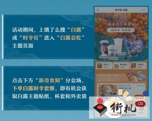 2、接着在下方的位置找到“新奇食刻”的分会场,下单白露时令套装,就会有机会获取白露主题贴纸、杯套以及外卖袋。