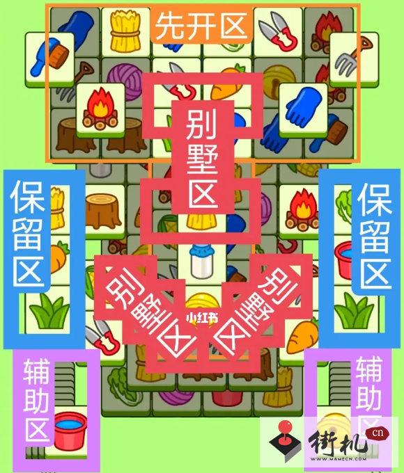 一个工字形大别墅,两个斜着的长型大别墅,开局先消除橙色区然后按照一层层均匀消除表面牌, 哪里压牌比较多就先消除哪里,必要时可以用盲盒区辅助消除表面牌。尽量还是以别墅区内互相消除为主。蓝色区有叠牌,但是不多,全部保留到后期使用。