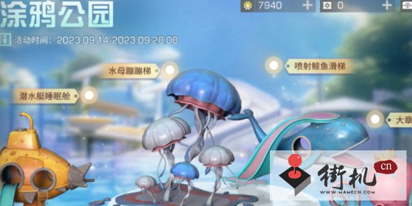 在2023年9月14日-9月28日活动期间,涂鸦公园家具奖池开启。玩家使用道具参与奖池活动有概率获得潜水艇睡眠舱、水水母蹦蹦梯、大章鱼靠椅等家具。
