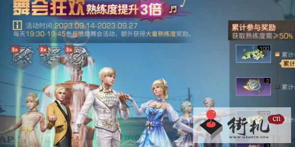 玩家在2023年9月24日-9月27日活动期间,每天19:30-19:45时段,参与喷泉舞会的玩家可获得全阶段活动熟练度的三倍加成,多次参与喷泉舞会活动还可解锁额外精美奖励。
