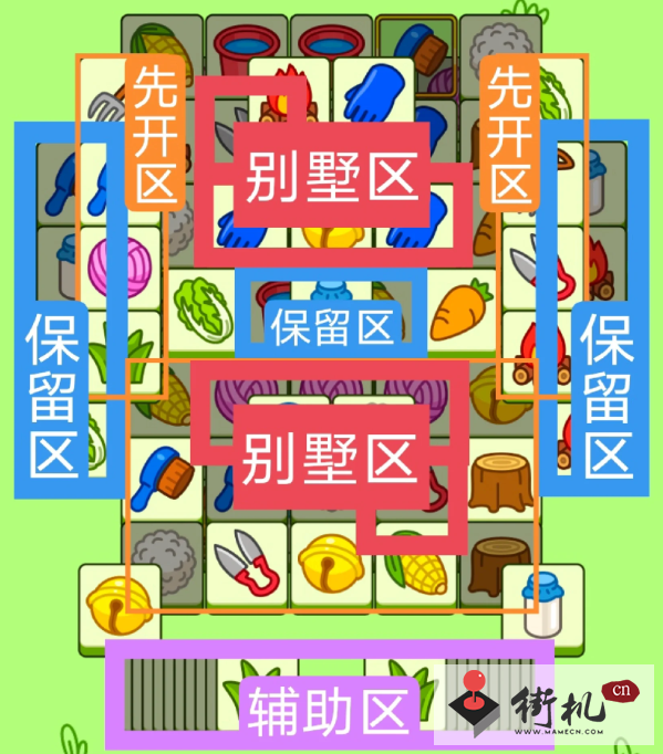 2.开局先消除橙色区的牌,这里压牌。尽量要让牌面保持在同一水平面,然后一层一层消除表面牌,不要跨层太多拿牌,等表面牌消除完后,以大别墅内互相消除为主。