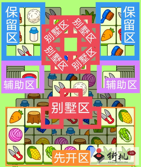 四个双叠牌小别墅,一个V字型大别墅,开局先消除橙色区,然后按照一层层均匀消除表面牌, 哪里压牌比较多就先消除哪里,必要时可以用盲盒区辅助消除表面牌。尽量还是以别墅区内互相消除为主。蓝色区有叠牌,但是不多,全部保留到后期使用。