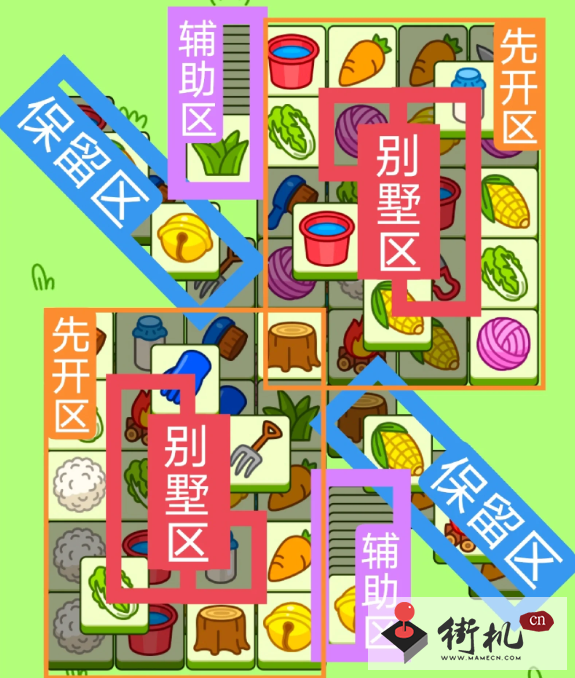 四个L字型大别墅组成,开局先消除橙色区,然后按照一层层均匀消除表面牌, 哪里压牌比较多就先消除哪里,必要时可以用盲盒区辅助消除表面牌。尽量还是以别墅区内互相消除为主。蓝色区有叠牌,但是不多,全部保留到后期使用。