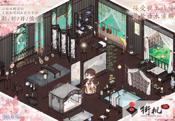 9月27日—10月6日,在小屋愿之庭限时阁【流音听雨榭】许愿,可获得精美云端水榭主题限定家具,集齐所有主题家具,还可获得小屋客人——祝羽弦!