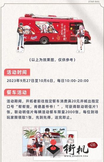 活动期间,开拓者前往指定餐车消费满20元并喊出指定口号“帮帮我,肯德基爷爷!”,可获得联动明信片1张。联动明信片每辆活动餐车限量2000张,每位到场玩家限领取1张,先到先得,送完即止。