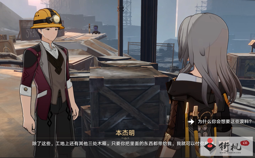 在大红圈范围内有4处有废料的木头箱子可以调查,在第一次调查后,可以触发对话,有个叫本杰明的哥们会向收这些废料。