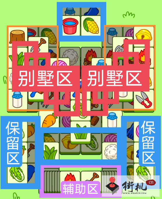 两个N字型大别墅,开局先消除橙色区,然后按照一层层均匀消除表面牌, 哪里压牌比较多就先消除哪里,必要时可以用盲盒区辅助消除表面牌。尽量还是以别墅区内互相消除为主。蓝色区有叠牌,但是不多,全部保留到后期使用。