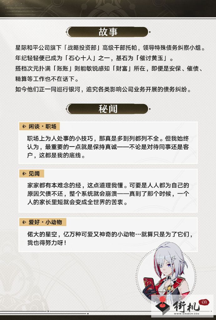 搭档次元扑满「账账」则能敏锐感知「财富」所在,即便是安保、催债、精算等工作也不在话下。