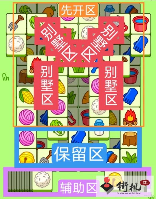 两个斜着的长型大别墅,两个长型大别墅,开局先消除橙色区,然后按照一层层均匀消除表面牌, 哪里压牌比较多就先消除哪里,必要时可以用盲盒区辅助消除表面牌。尽量还是以别墅区内互相消除为主。蓝色区有叠牌,但是不多,全部保留到后期使用。