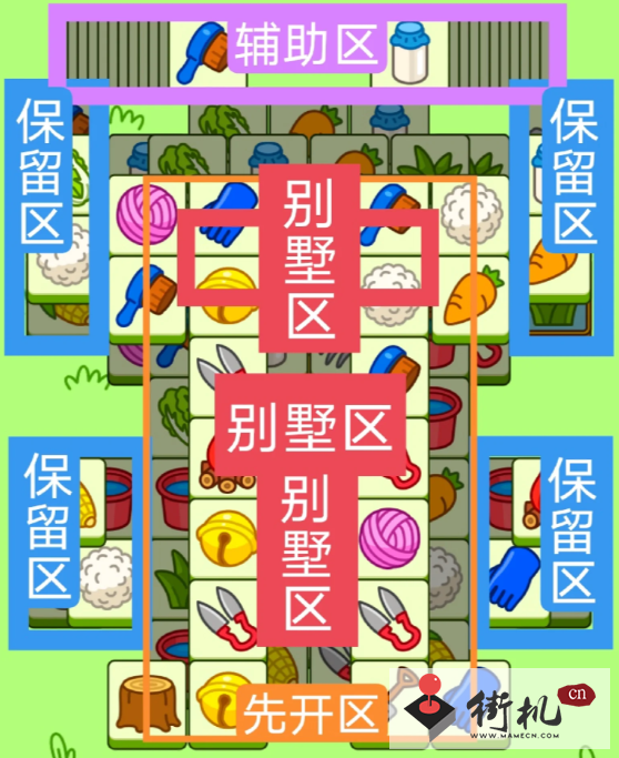 一个十字形大别墅,两个长形大别墅,开局先消除橙色区,然后按照一层层均匀消除表面牌, 哪里压牌比较多就先消除哪里,必要时可以用盲盒区辅助消除表面牌。尽量还是以别墅区内互相消除为主。蓝色区有叠牌,但是不多,全部保留到后期使用。