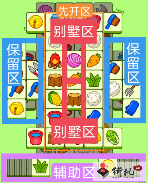 两个T字型大别墅,开局先消除橙色区,然后按照一层层均匀消除表面牌, 哪里压牌比较多就先消除哪里,必要时可以用盲盒区辅助消除表面牌。尽量还是以别墅区内互相消除为主。蓝色区有叠牌,但是不多,全部保留到后期使用。