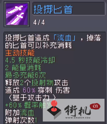 1、投掷匕首对敌人造成流血伤害,掉落的匕首可补充消耗。